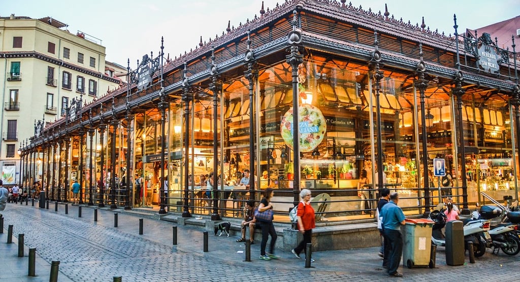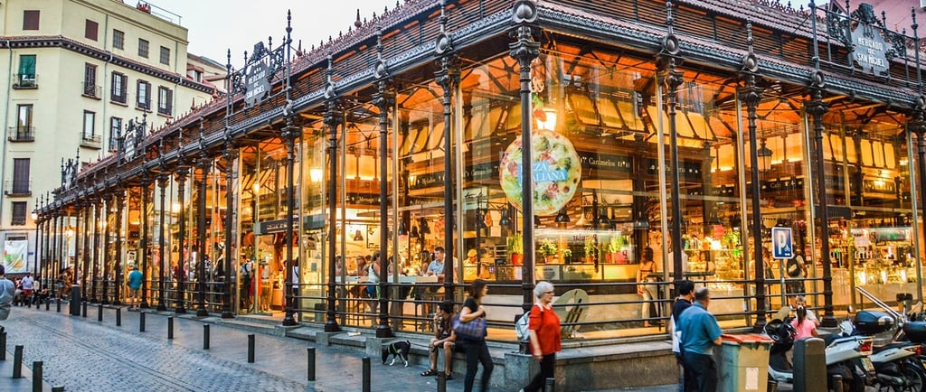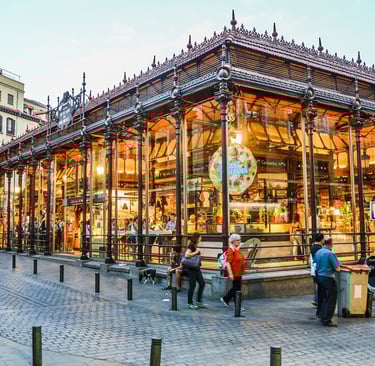 Un mercado gastronómico en un edificio de hierro fundido del siglo XX. Aquí puedes degustar tapas gourmet, ostras, jamón ibérico, quesos, vinos y más.